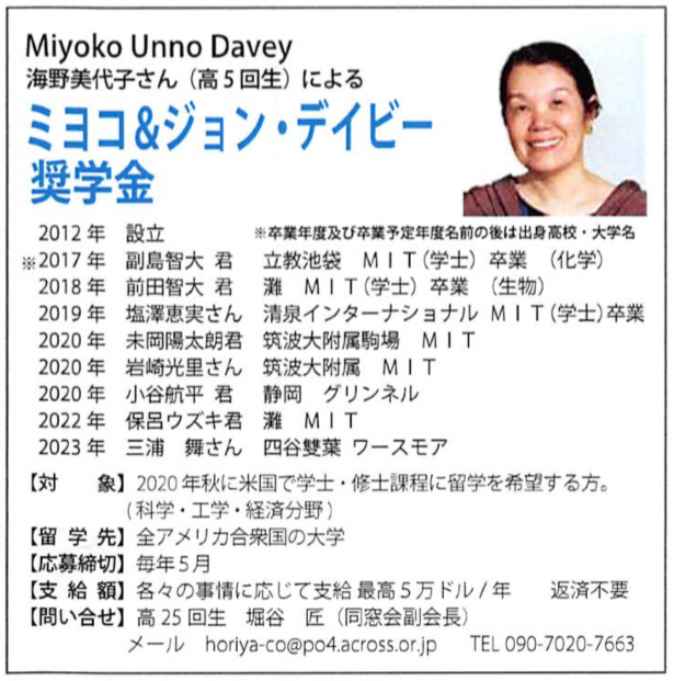 アメリカへの留学生の奨学金の紹介、清水東高生のアメリカサマーキャンプ参加への支援、清水東OB・OGの大学生への就職支援